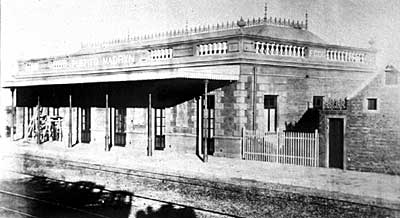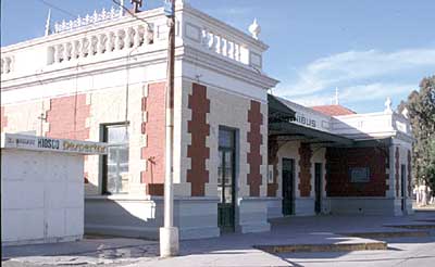 La otra fachada de la estación Puerto Madryn como vista en 2000. Después de la clausura del ferrocarril era la terminal de ómnibus durante unos cuarenta años. Hoy una terminal nueva está sobre el viejo terreno ferroviario. El edificio va a ser restaurado como museo de la ciudad.