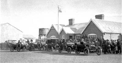 Vista de la estación Trelew, del lado de la ciudad, con una gran colección de automóviles antiguos. La fecha y la ocasión son desconocidas.