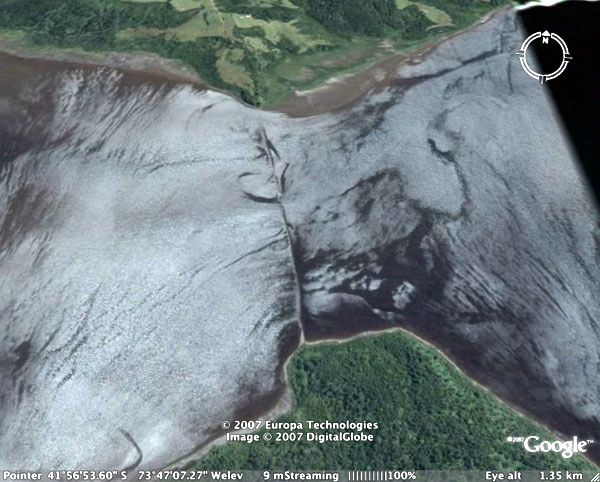 Los movimientos de la tierra en consecuencia del terremoto de Valdivia en 1960 que ayudaban la clausura tenían grandes efectos. En este caso, el norte de Chiloé bajo por unos dos o tres metros y por consecuencia se han inundado partes de la línea cerca el nivel del mar. Es más obvio en el sitio del puente San Antonio que antiguamente tenía una longitud de 45 metros, acercado en los dos lados por terraplenes. Hoy el agua tiene una anchura de 1.200 metros y cubre los terraplenes. Es obvio que no muestran los mapas modernas la traza antigua por la superficie sumergida. Pero una vista desde la cima de una colina cercana deja ver, especialmente en bajamar, los terraplenes bajo el agua. También se ven en vistas aéreas, o de satélite disponibles en programas como Google Earth. Esta foto de Google Earth muestra el sitio del antiguo puente San Antonio. La ruta llega desde Ancud al lado del litoral a la derecha arriba del mapa hasta el centro arriba, pues tenía rumbo hacia el sur sobre un terraplén bajo hasta el puente, posiblemente de unos 50 m de longitud sobre un río de aguas mansas con régimen de marea y continuaba sobre terraplén similar hasta la zona boscosa abajo donde se cambió rumbo hacia el sudoeste. El total de los 1.200 m de terraplén y puente están ahora bajo el agua y visible como sendero bajo el agua.