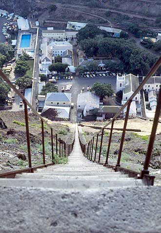 Una vista de hoy por el Señor Barry Weaver, mire por abajo de la escalera hasta Jamestown. Están a cada lado de los peldaños una rampa inclinada de bloques de piedra. Mientras la obra fue reconstruida en 1875, estas rampas pueden ser la base de la vía antigua.