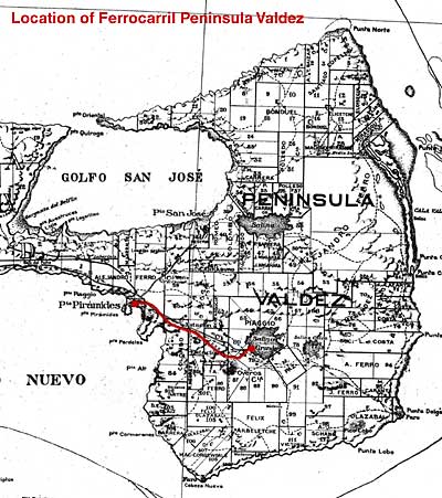 Está debajo parte agrandada del mapa propietario de arriba. Se ve el ferrocarril como una línea alternando entre blanco y negra, saliendo de Puerto Pirámides hacia el este y curvando hasta el este sud este en la mayor parte al lado sur de la carretera vieja hasta la salina. Hay dos estaciones intermedias antes la última curva al nordeste a la entrada a la bajada de la salina. Los apellidos Piaggio y Ferro, los propietarios principales del ferrocarril son notados como los dueños de unos terrenos.