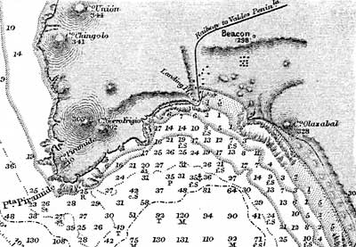 El mapa de abajo muestra la península y el ferrocarril delineado por la línea roja. Este, y parte de escala más grande (más abajo), eran extraídas de un mapa de propiedad de terrenos chubutenses de los años 1920. (3)